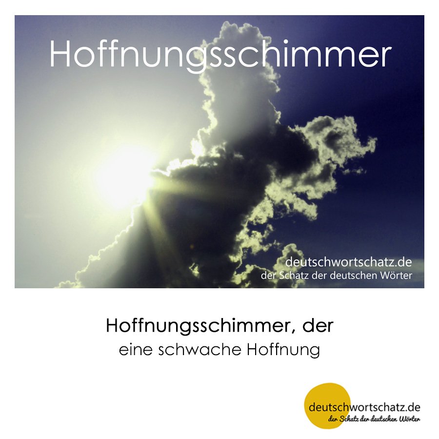 Die allerschönsten Wörter, Gefühle und Stimmungen Veröffentlicht am 20. Januar 2015 Schreibe einen KommentarHoffnungsschimmer von deutschwortschatz Hoffnungsschimmer, der– eine schwache Hoffnung –Hoffnungsschimmer – ein kleines Licht am Ende des Tunnels, ein Leuchten am Horizont, manchmal der letzte Rest, oft aber auch das erste Fünkchen Hoffnung.