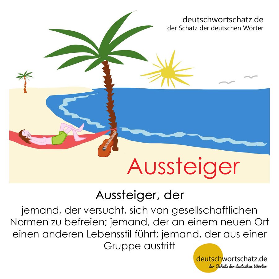 Intuitiv hat es mich gleich zu diesem ‘Schatzwort’ gezogen; denn ich erlebte mehrere Aussteigererfahrungen und wenn ich jetzt täglich in mein Atelier – das bezeichnenderweise den Namen ‘NeuSehLand’ trägt, aber nicht mal in Anlehnung an den Inselstaat Neuseeland, sondern wegen ‘neuer, anderer Art zu sehen’ – gehe und hinter mir die Tür schließe, dann ist dies auch jedesmal der räumlich vollzogene Ausstieg, der dem mentalen folgte. Trotzdem zieht es mich wieder auf eine Insel, es muss ja keine ‘Schatz(wort)insel’ sein. – Und was suche ich hier im ‘Deutschwortschatzland’? – Es zieht mich doch wieder an, denn mein erster Ausstieg war der auf dem Weg zum zweiten Staatsexamen für Deutsch- u. Kunstlehrer an Realschulen. – Ich finde es einfach toll, dass es solch sprach- und illustrationbegeisterte und -begeisternde Menschen wie Euch gibt.