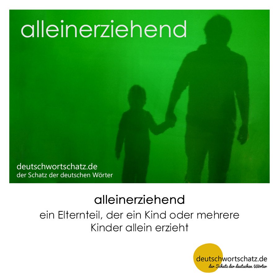 Ein Wort aus der Liste der hervorragenden und es auf den Punkt bringenden deutschen Partizipien. Im Prinzip reicht da ein Partizip aus. Alleinerziehend: Die Eltern haben sich getrennt – getrenntlebend ist auch so ein Partizip – und erziehen folglich auch ihr Kind nicht mehr gemeinsam. Es kann auch sein, dass ein Elternteil gestorben ist oder nie mit dem Vater oder der Mutter des Kindes in einer Beziehung gelebt hat. In jedem Fall wächst das Kind entweder beim Vater oder bei der Mutter auf. Wir sprechen von einem alleinerziehenden Vater oder einer alleinerziehenden Mutter. Er oder sie ist alleinerziehend. Aus dem Partizip machen wir dann noch die Person: der oder die Alleinerziehende. Und fertig.