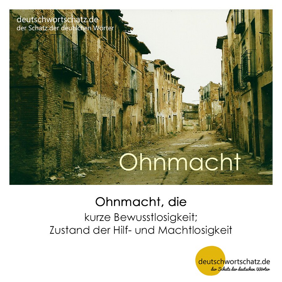 Was es ist Veröffentlicht am 8. Dezember 2015 Schreibe einen KommentarOhnmacht von deutschwortschatz Ohnmacht, die– kurze Bewusstlosigkeit; Zustand der Hilf- und Machtlosigkeit –Das Gefühl, nichts tun zu können, die quälende Gewissheit, gar nichts ausrichten zu können. Zum Zuschauen verdammt, tatenlos, hilflos, machtlos, ohnmächtig, ohne Macht.
